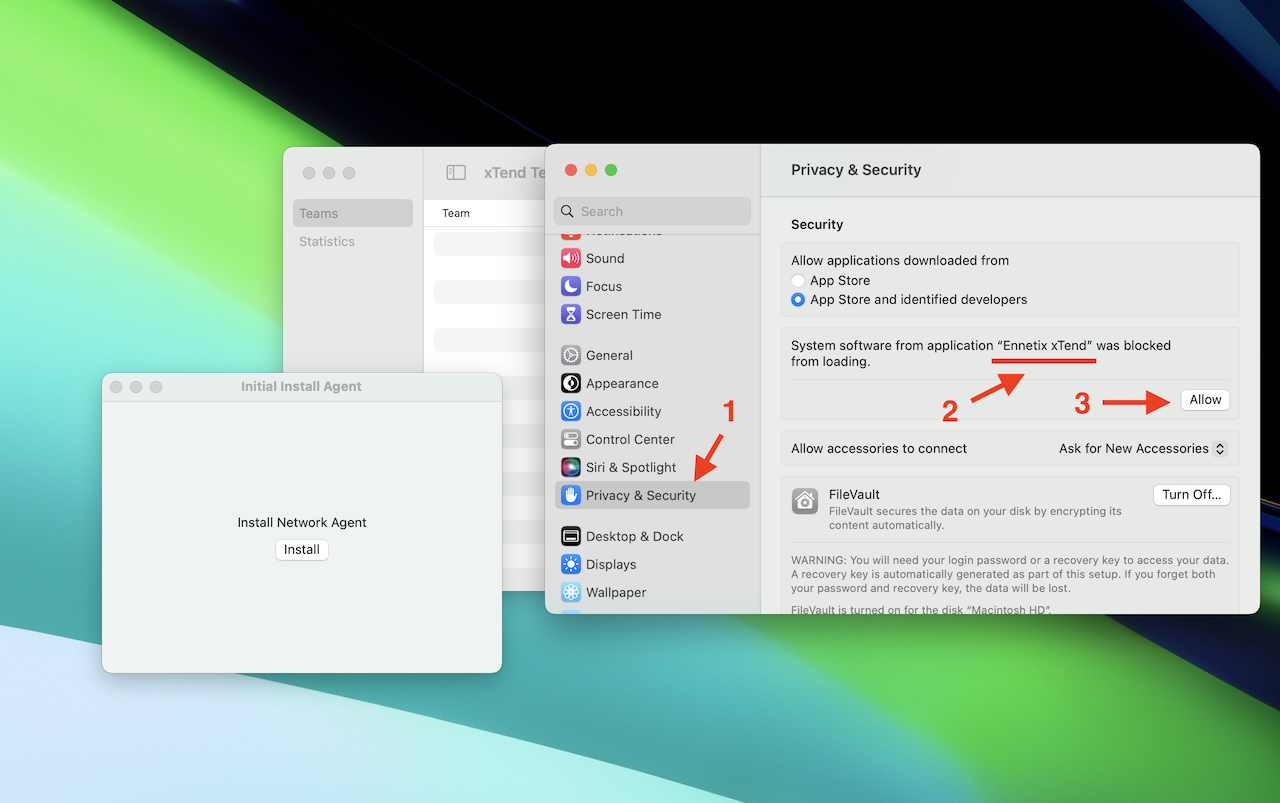 Click the “Allow” button (3). (If you don’t see the prompt to “Allow” “Ennetix xTend”, see troubleshooting section below)