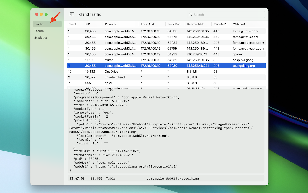 Congratulations! xTend can now display your network traffic. The “Traffic” tab will appear in the navigation column in the main window. You can close the “Initial Install Agent” window.